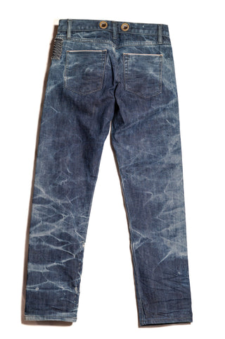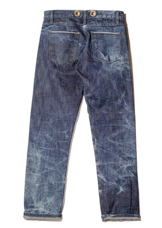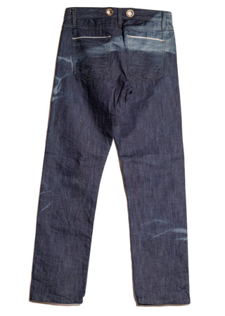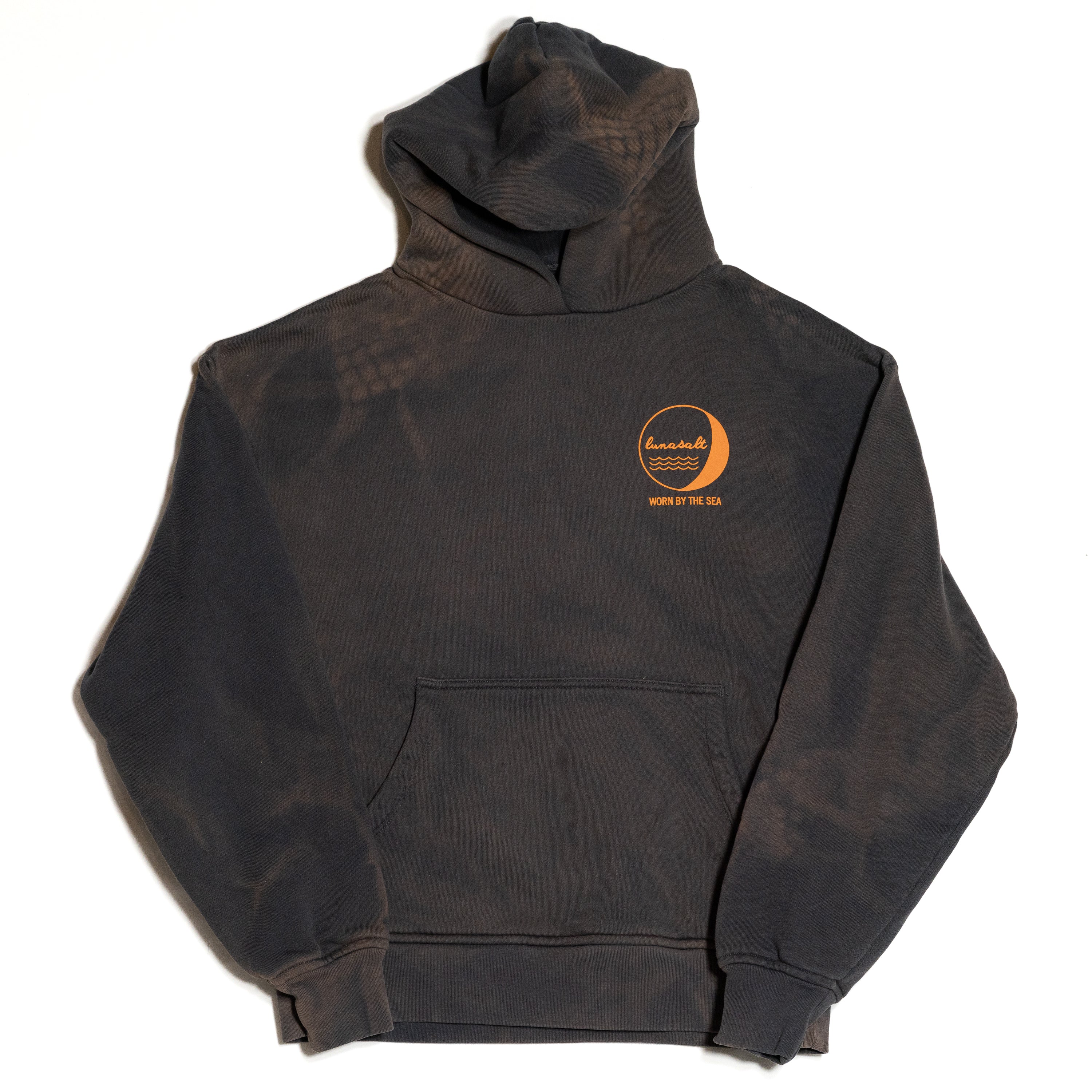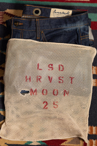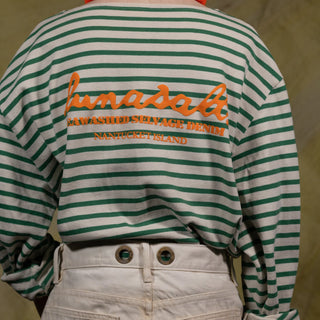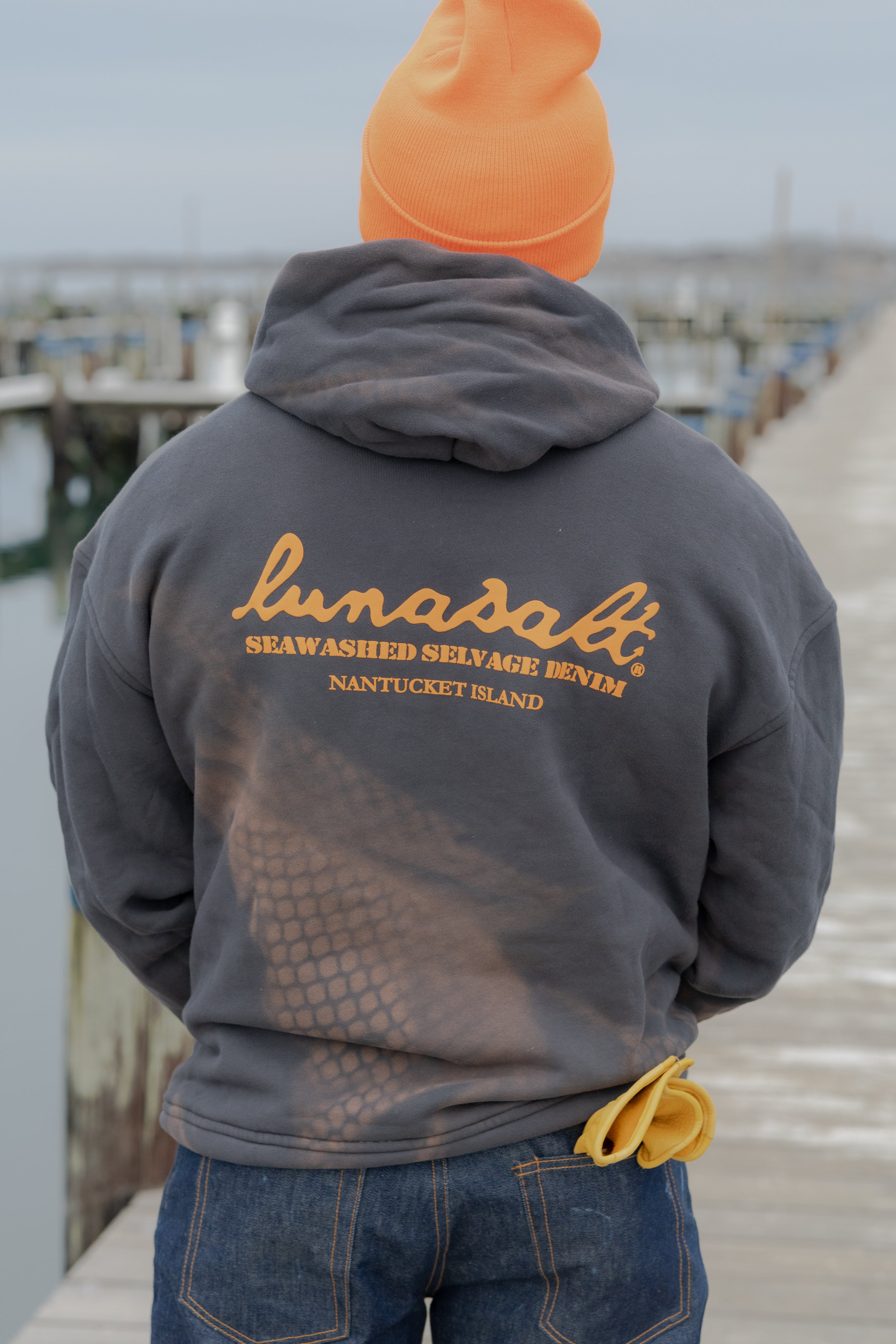 Branding is kept direct and maritime: a raised orange puff screen print at the left chest featuring the crescent moon mark, lunasalt script, wave lines, and WORN BY THE SEA. The back carries lunasalt script with SEAWASHED SELVAGE DENIM and NANTUCKET ISLAND, reading like working waterfront signage rather than fashion graphics.