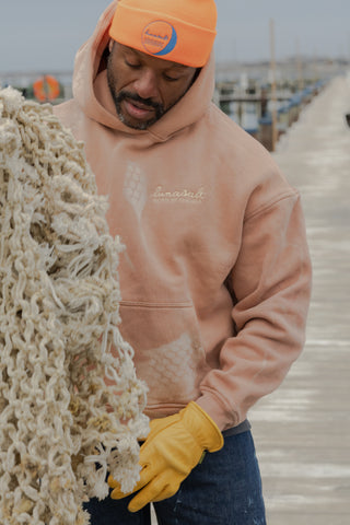Relaxed, heavyweight fleece naturally finished by saltwater and proven at Sea.