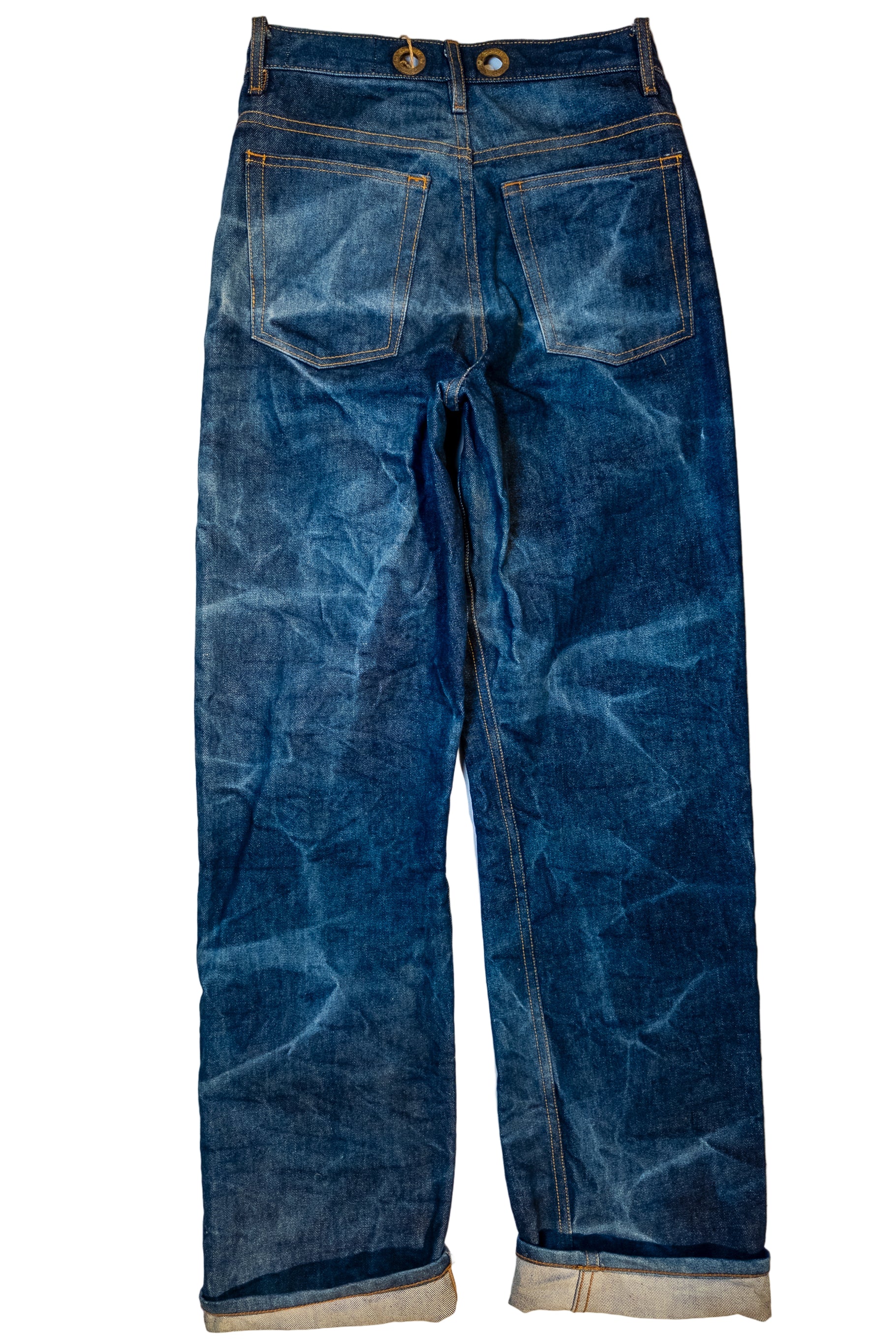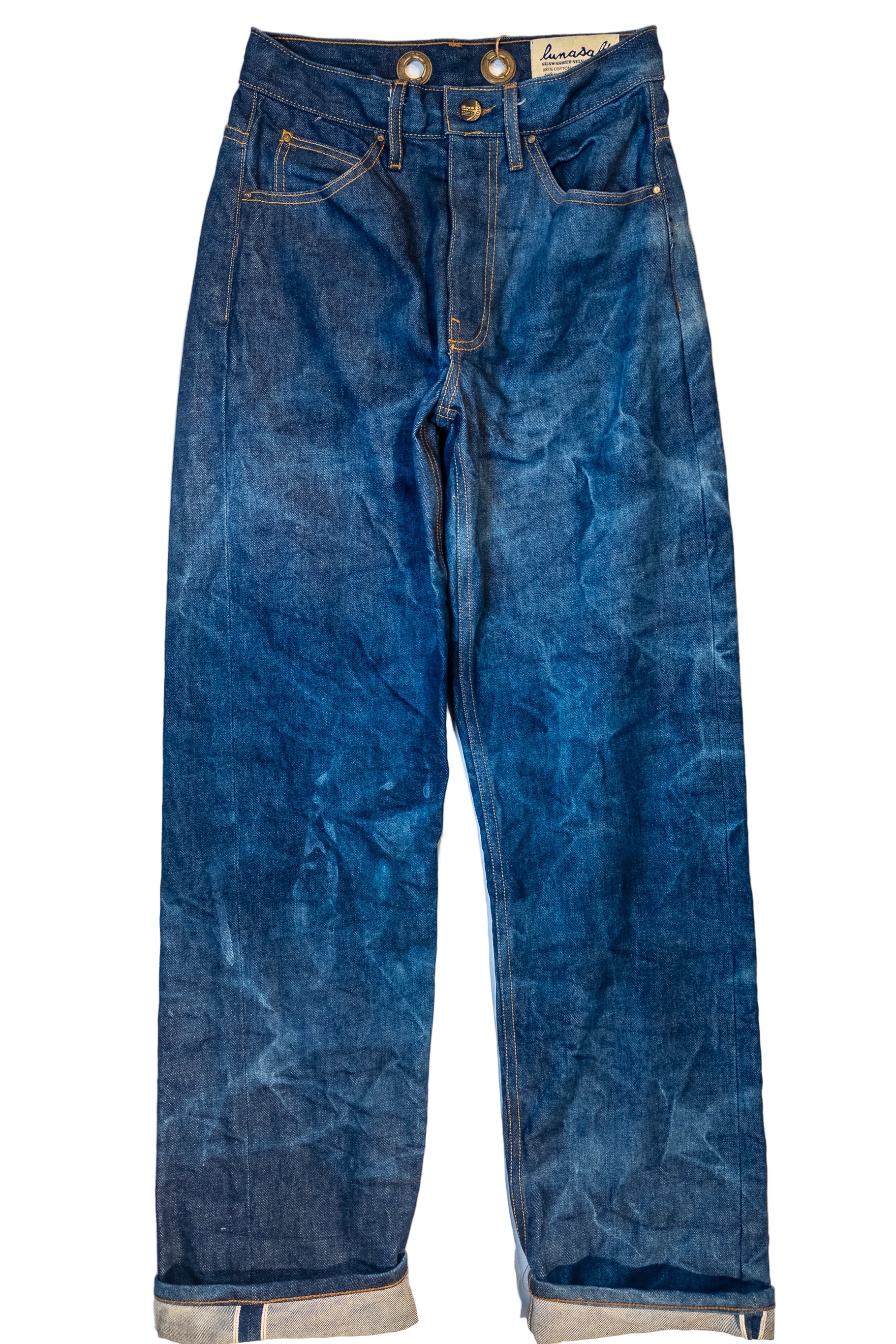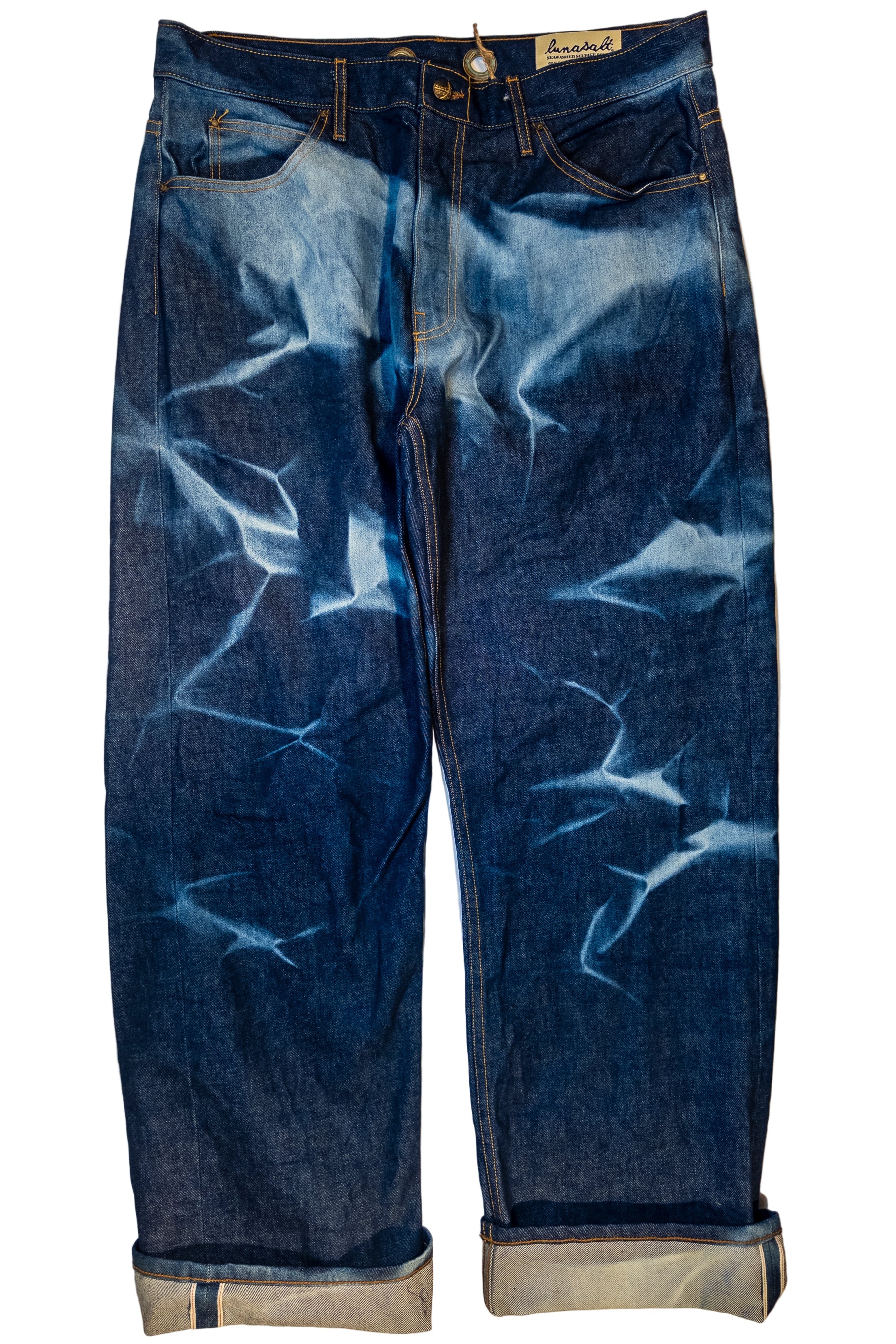 This pair carries deep tidal indigos, warm rust undertones, and salt-cured highs. The finish is natural, raw, and completely unreproducible—a living tide chart pressed into cloth.