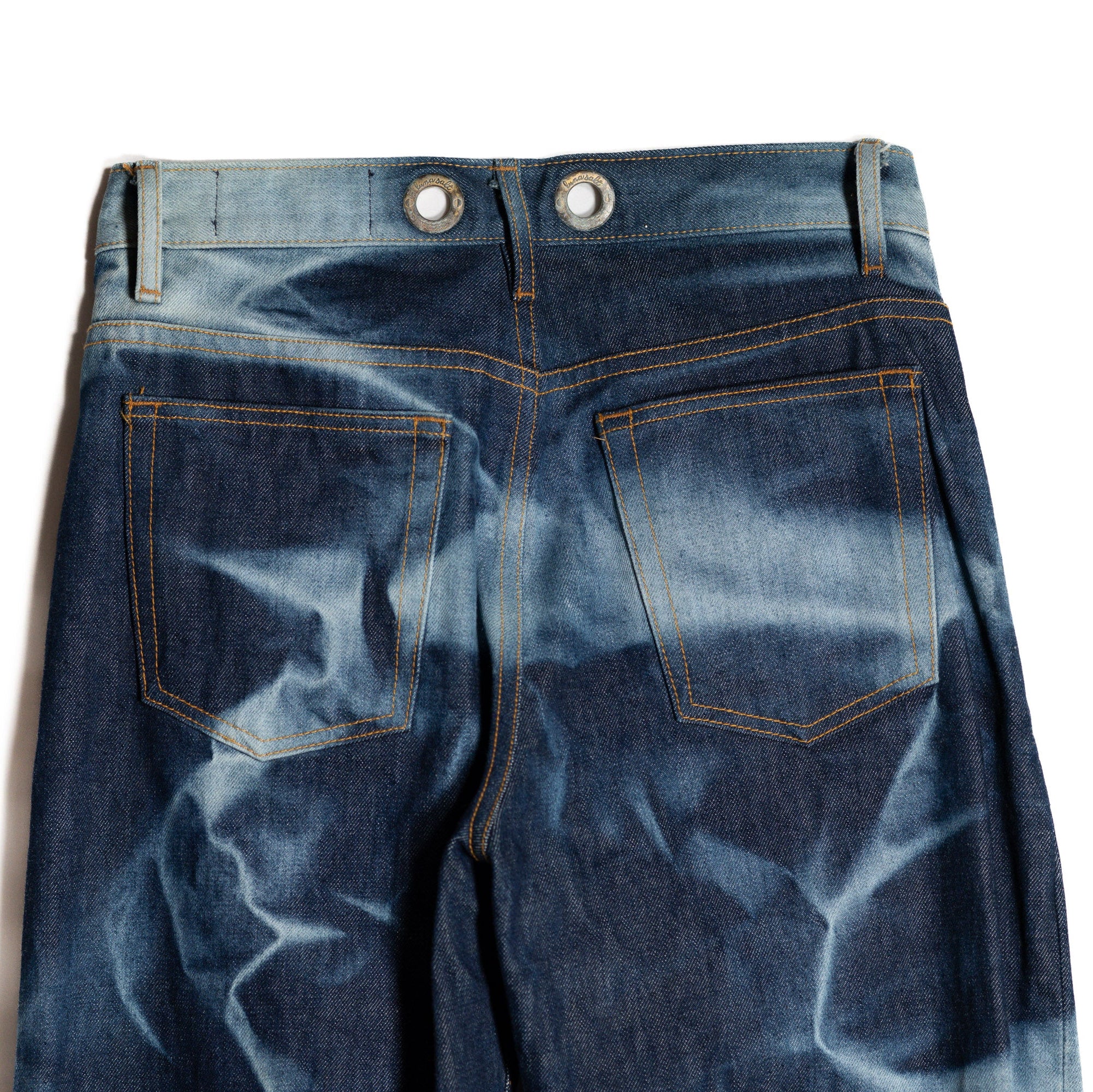 Deep indigo with high-contrast wear through the seat and leg. Mineral staining and tidal patterning are present throughout, especially along stress points and seams.