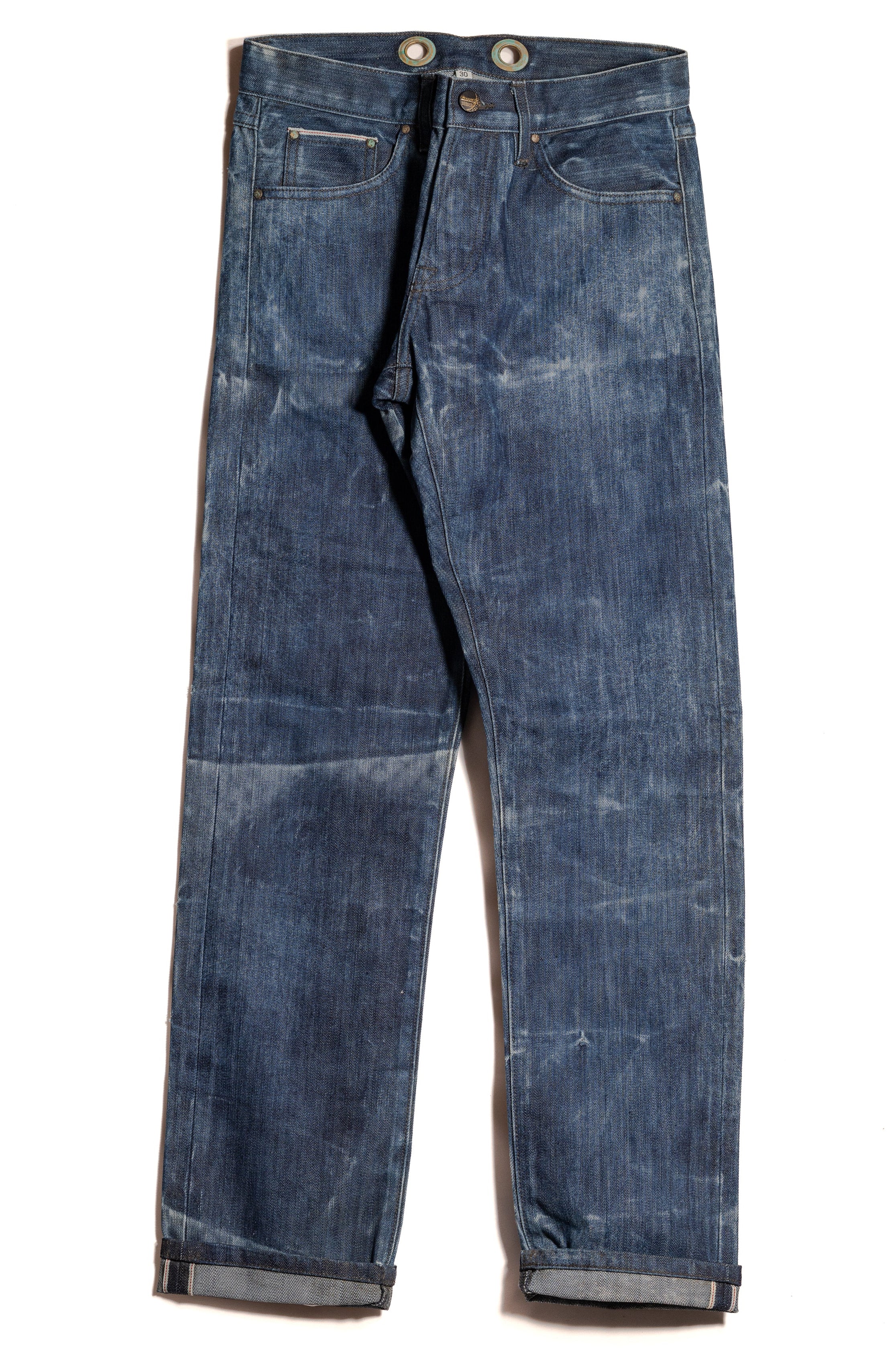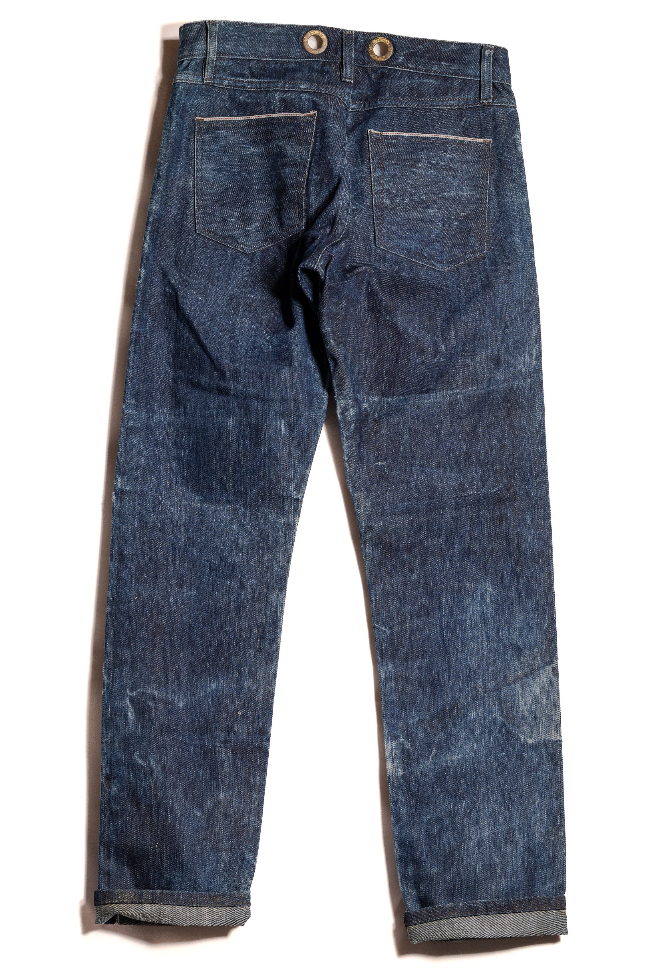 This pair was aged during the Bud Moon—early spring conditions, cold water, and slow change—resulting in soft denim with restrained contrast and a settled, even tone.