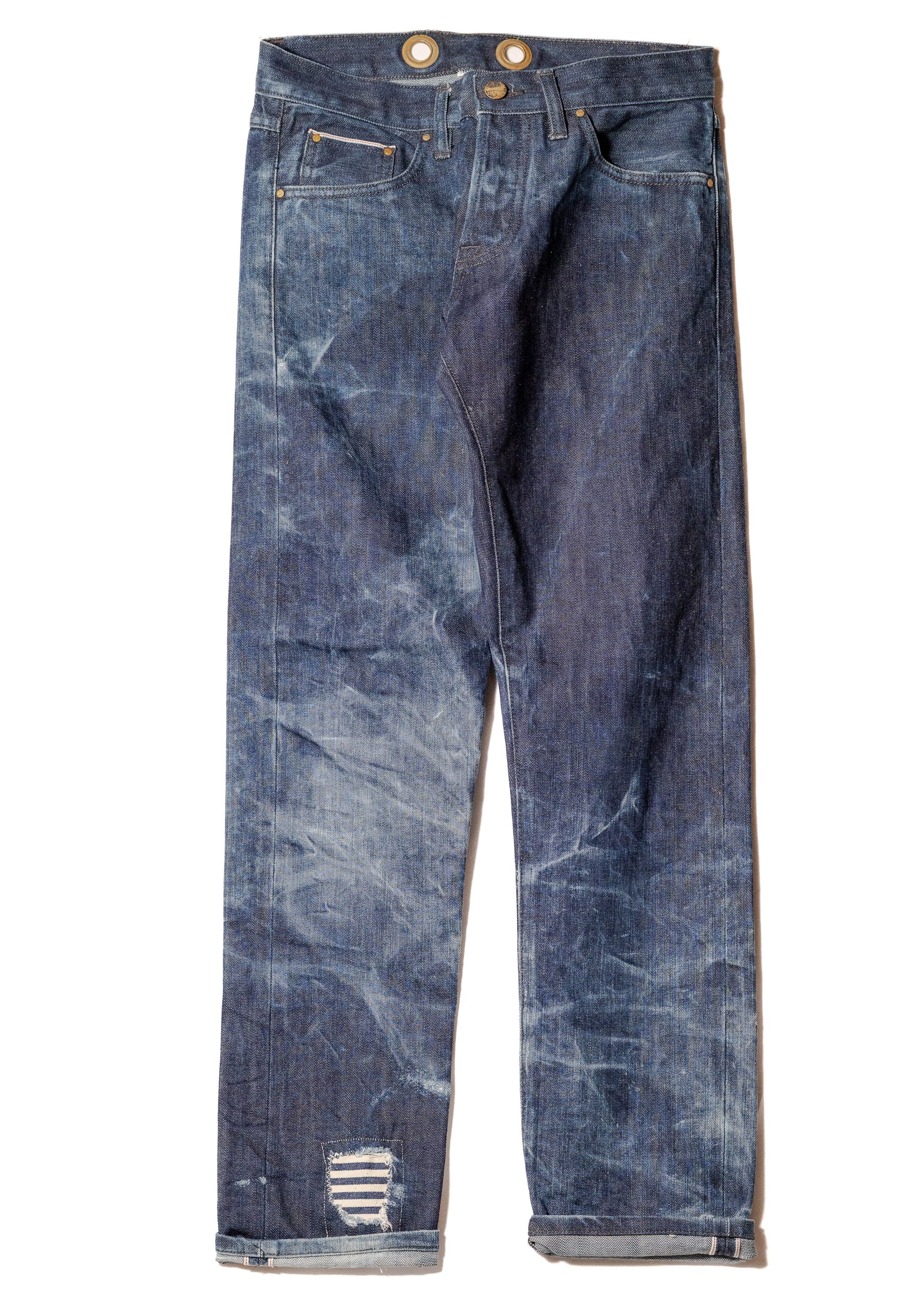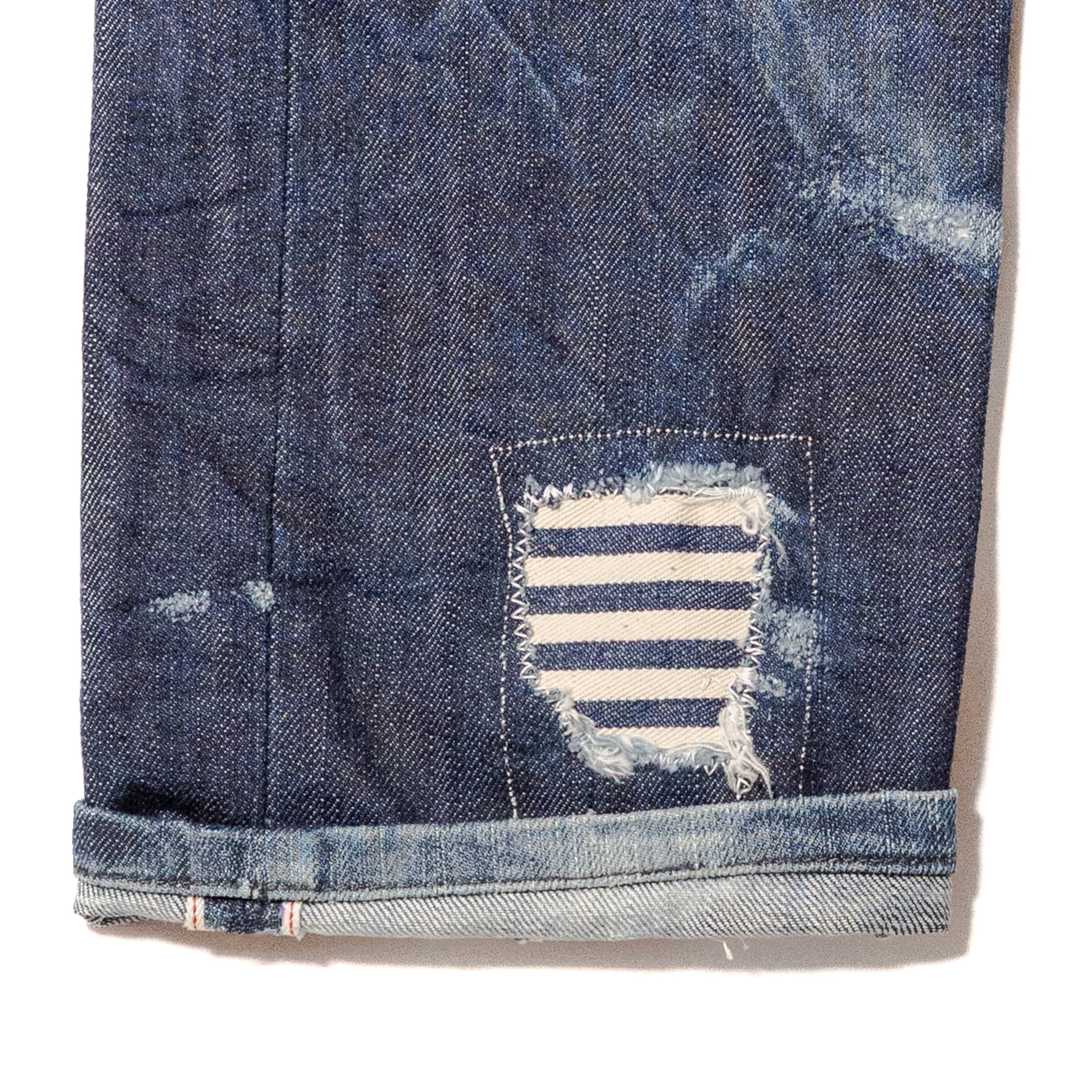 During the wash, the lower right leg developed structural wear and was reinforced using hand-stitched hickory stripe patchwork. The repair follows the shape of the damage rather than concealing it, adding strength while preserving the history of the wash.