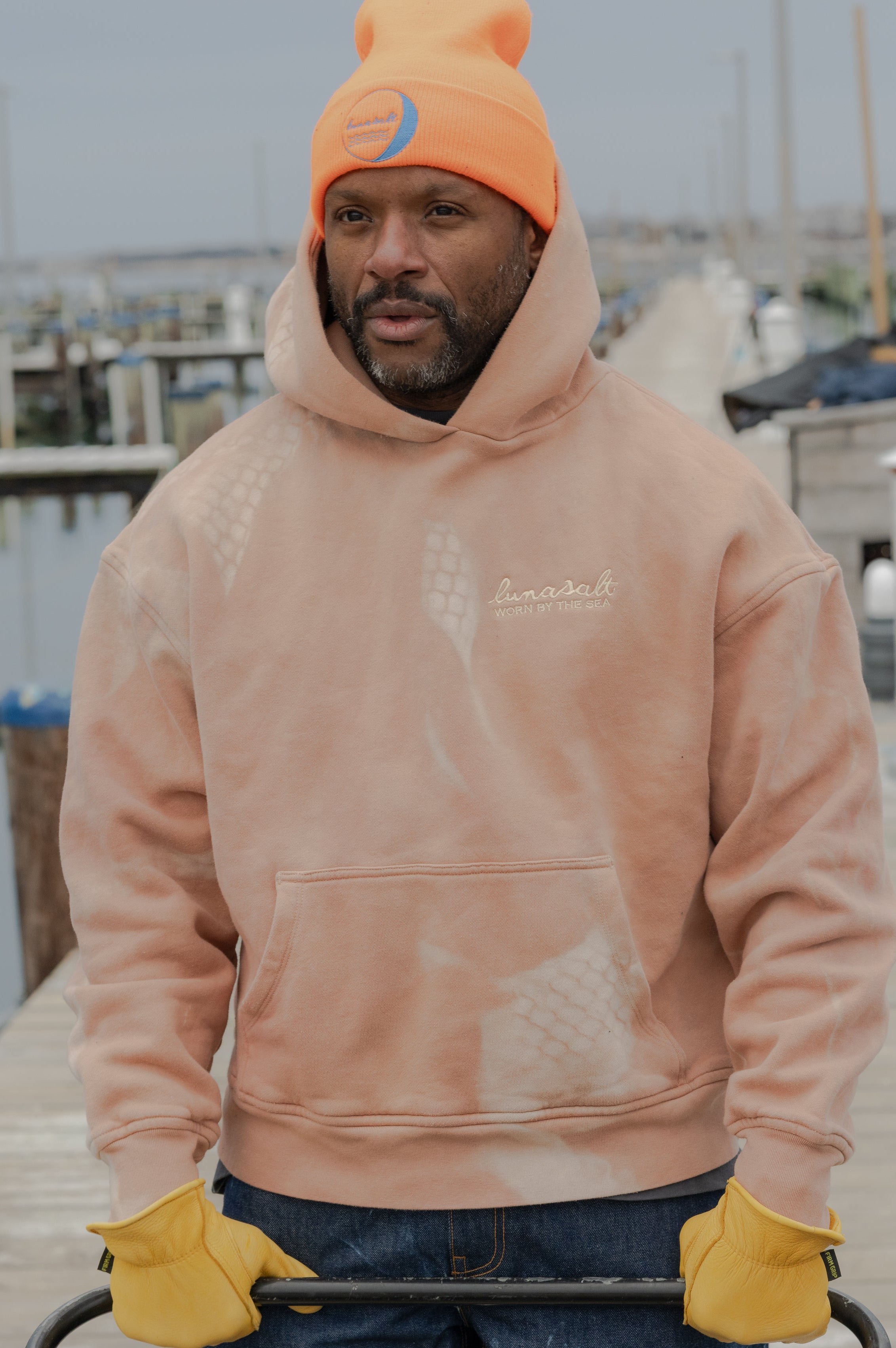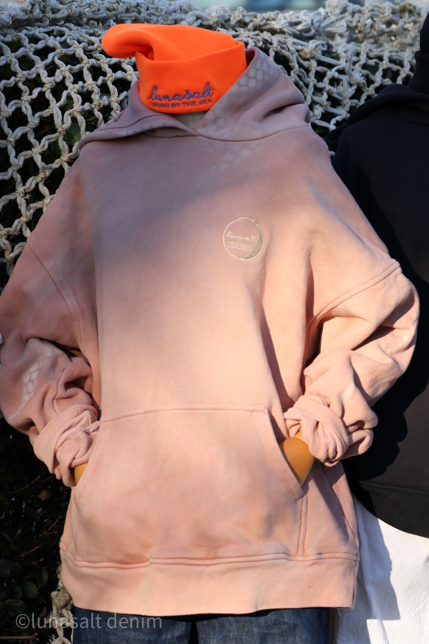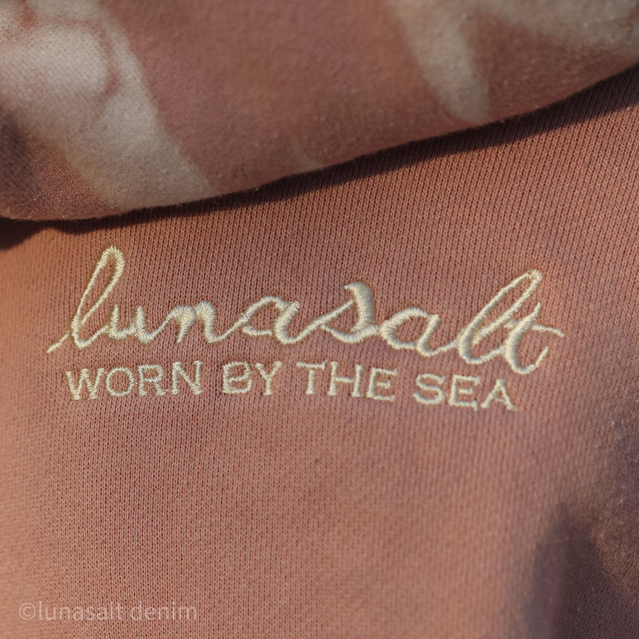 Each Deck Pullover Hoodie in the OYSTR-WASH begins with a hand-dyed madder-root base, prepared on Nantucket in small batches to create a warm, organic red that sits naturally within the island’s landscape. From there, every piece spends twenty-eight days and twenty-eight nights sealed in an oyster bag and submerged in Nantucket’s tidal water, following the Harvest Moon cycle. Salt, current, and sun do the rest, softening the fleece and shifting the color with quiet, natural variations you cannot fake or repeat.