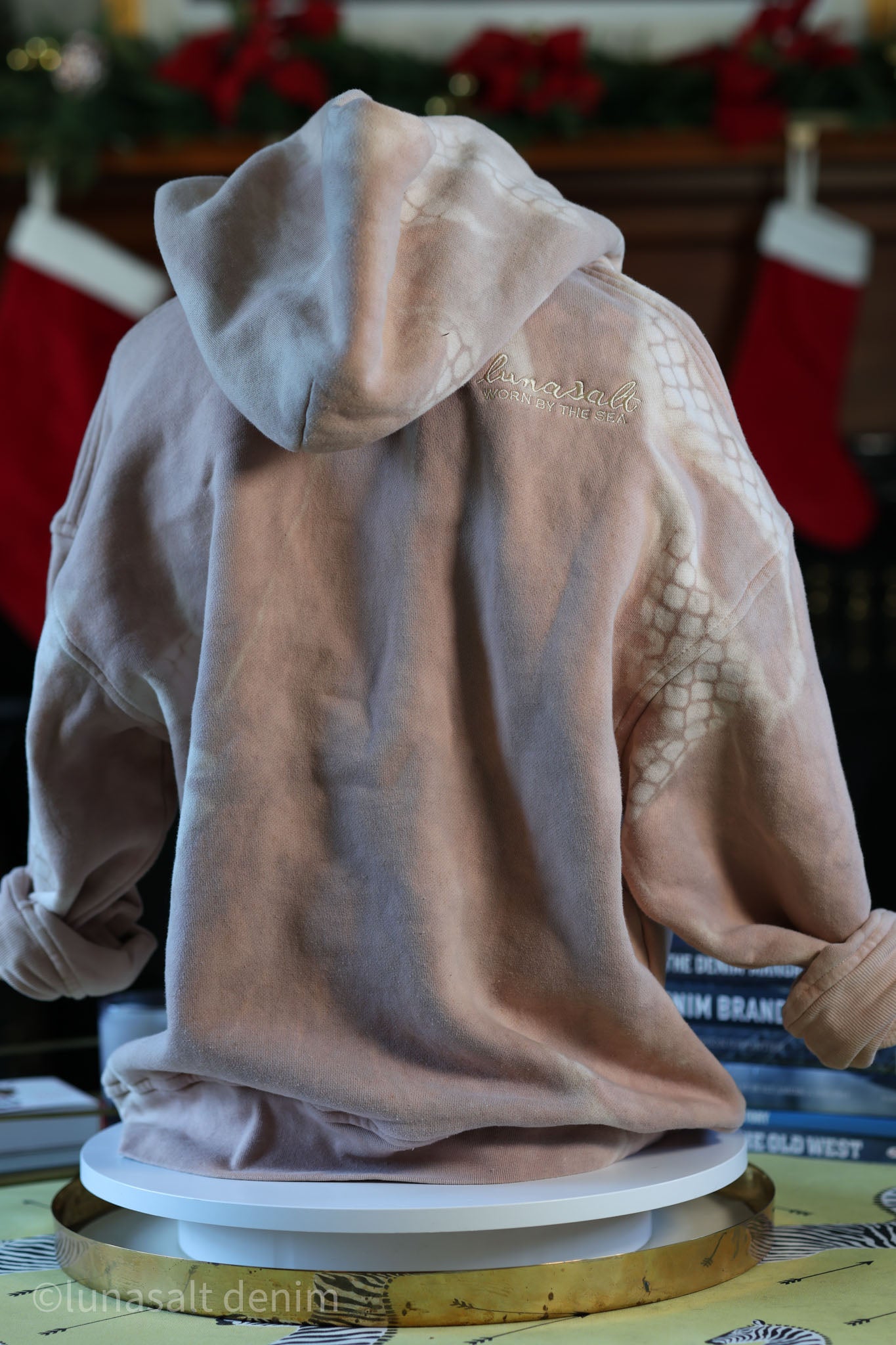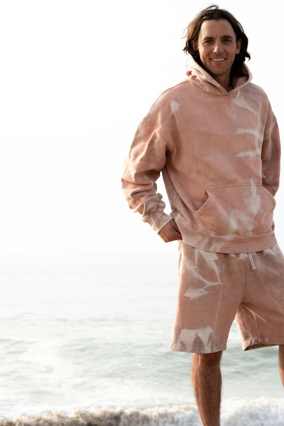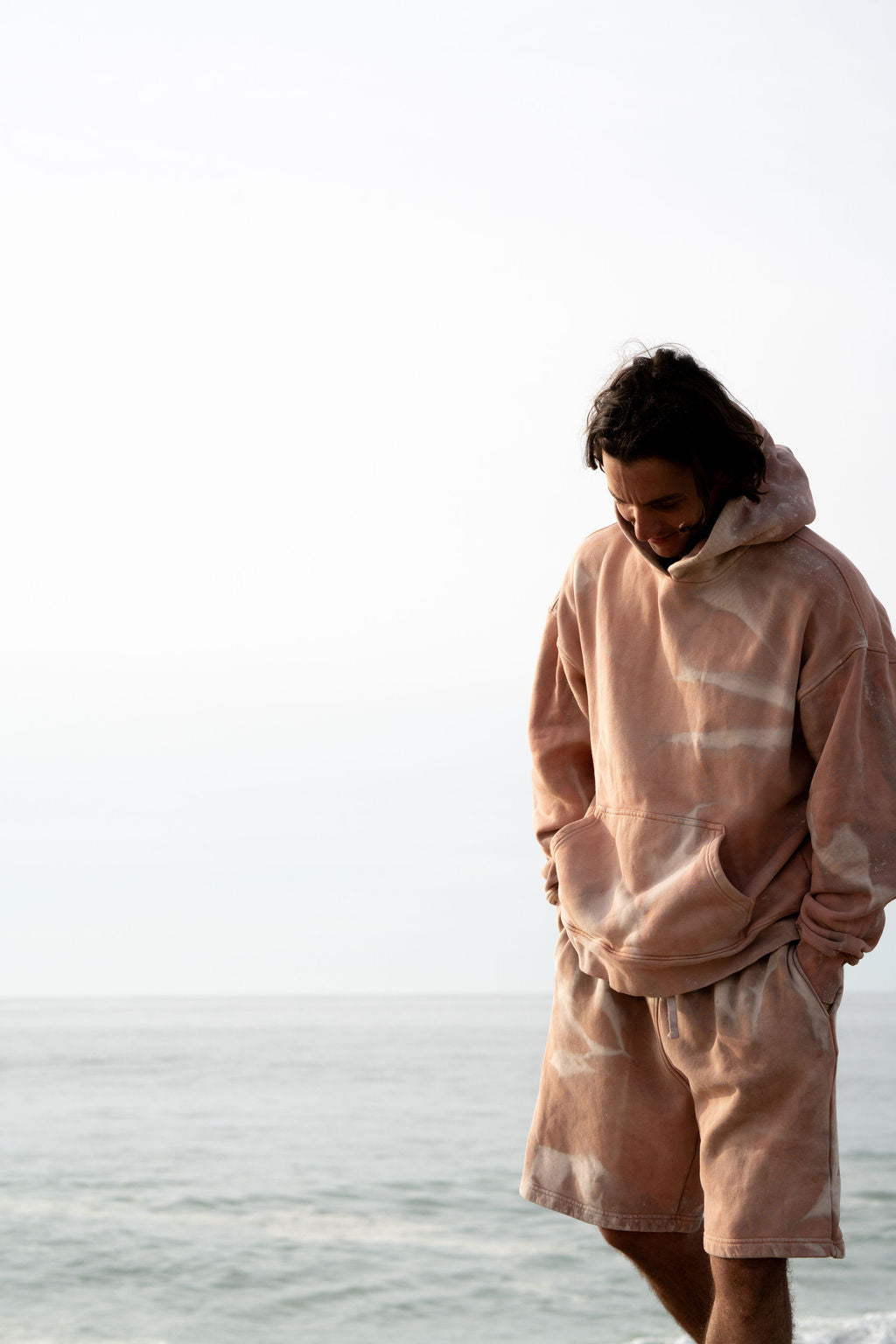 Each Deck Pullover Hoodie in the OYSTR-WASH begins with a hand-dyed madder-root base, prepared on Nantucket in small batches to create a warm, organic red that sits naturally within the island’s landscape. From there, every piece spends twenty-eight days and twenty-eight nights sealed in an oyster bag and submerged in Nantucket’s tidal water, following the Harvest Moon cycle. Salt, current, and sun do the rest, softening the fleece and shifting the color with quiet, natural variations you cannot fake or repeat.