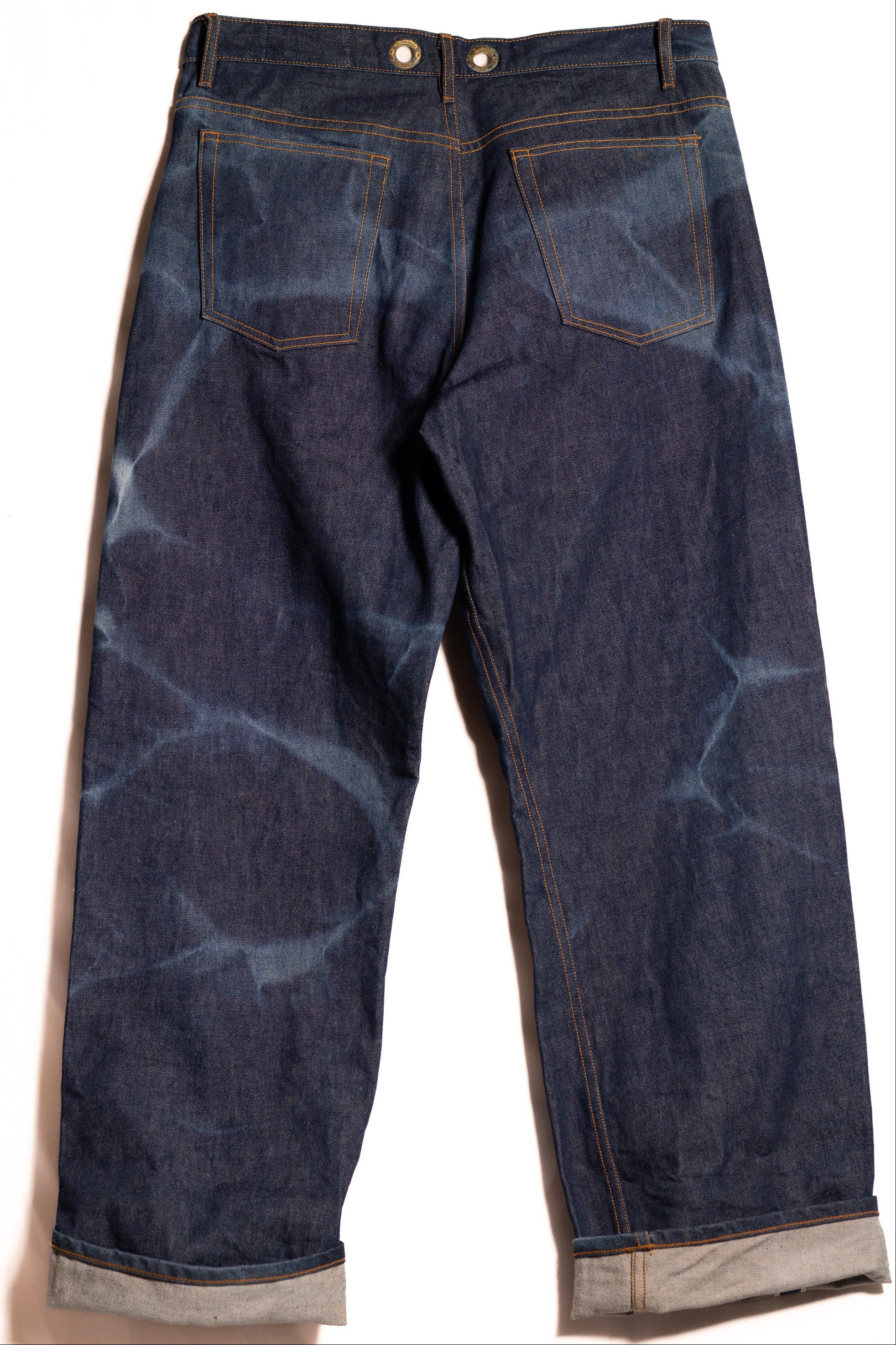 Deep, settled indigo with uneven fade development through the leg and seat. Seasonal mineral staining and salt patterning are present, particularly along seams and stress points.