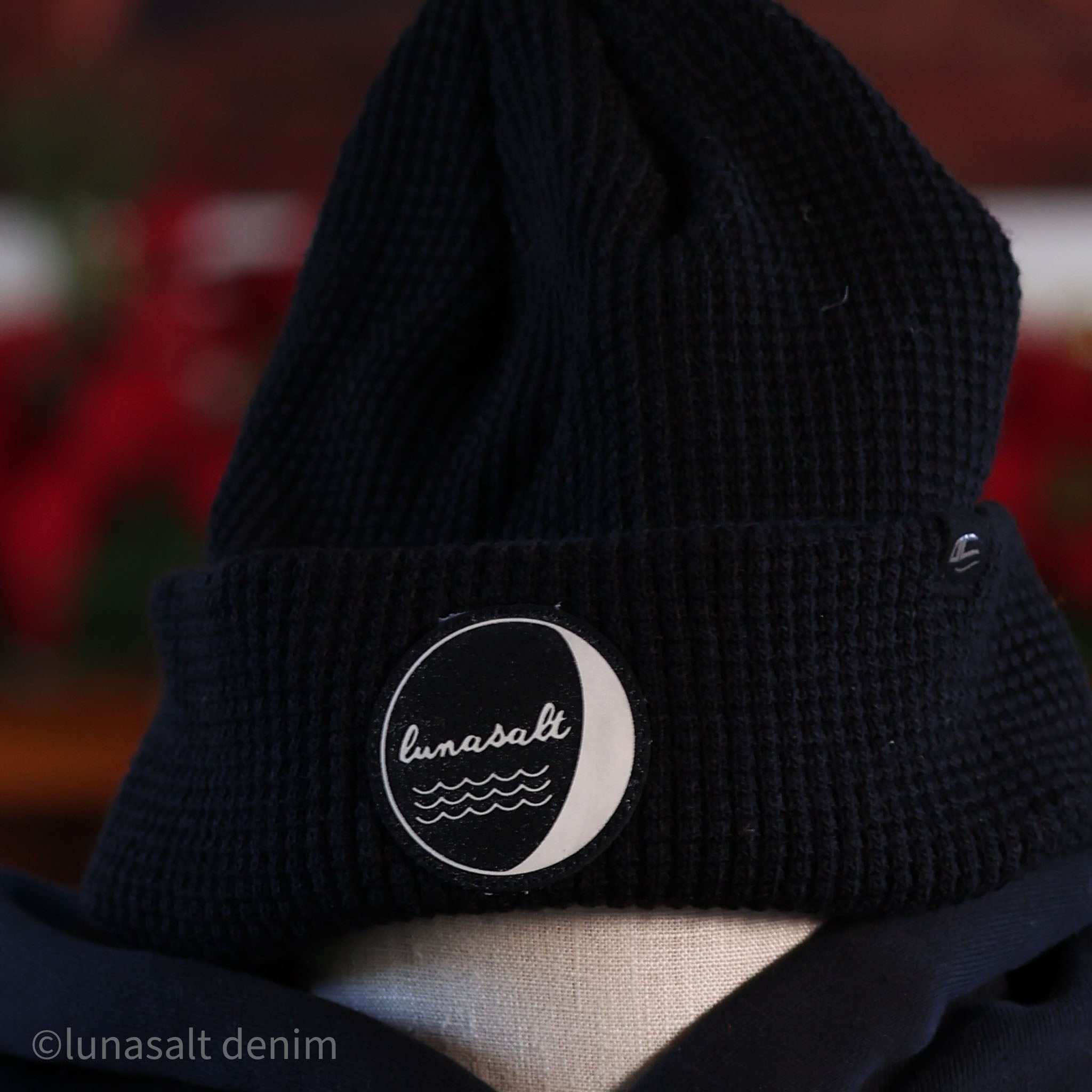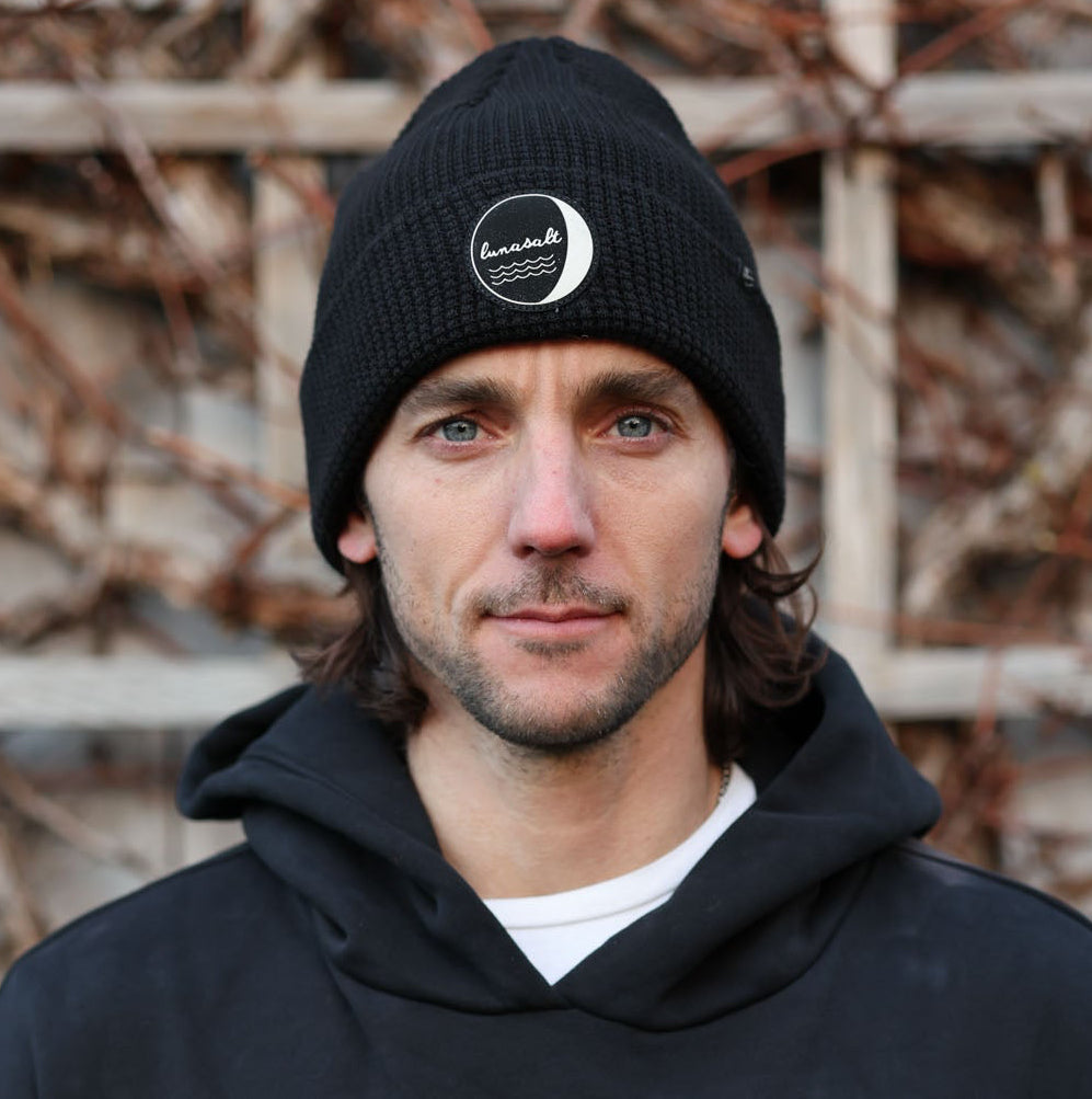 Finished with the Lunasalt woven patch at the cuff, the mark sits forward and balanced, adding a quiet signal of the brand without overpowering the simplicity of the knit. The deep black tone pairs naturally with outerwear, fleece, and deck layers, making it a reliable anchor piece across the season.