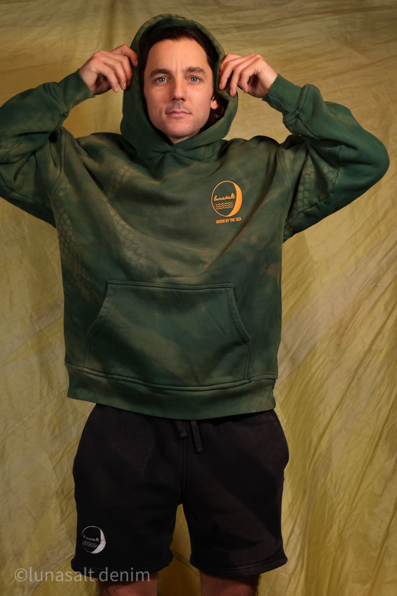 Each Deckwear Pullover Hoodie in Sea Green begins with heavyweight cotton fleece dyed to a deep maritime green—muted, earthy, and intentionally uneven. The dye settles into the fleece rather than coating it flat, allowing the surface to carry depth and tonal movement that responds to light, wear, and salt exposure over time.